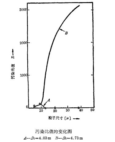 該過濾管在1.2和1.9m壓頭差下下操作獲得凈化產(chǎn)品,其污染程度低于1ppm。在壓頭差為4.0米0米時則污染程度約可達3PPmo污染系數(shù)的定義是污染的油與凈化的油中計數(shù)粒子的比值不同壓力下,粒子大小與污染比值的關(guān)系見圖,曲線中污染比值和粒子分布系指凈化油被水所污染。