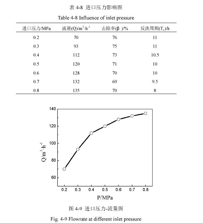 從圖可以看出,隨著壓力的,流量也不斷上升,當(dāng)進(jìn)口壓力的時候流量達(dá)到設(shè)計要求·,當(dāng)壓力超過以后,流量隨壓力上升開始變得緩慢。反洗的指示標(biāo)準(zhǔn)是當(dāng)出口壓力較初始運(yùn)行時的出口壓力(由于進(jìn)口壓力不同,出水壓力也不相同)差小于時進(jìn)行人工反洗。從經(jīng)驗得出當(dāng)出口壓力下降以后,流量開始較大幅度降低,為確保處理流量在此時進(jìn)行反洗比較恰當(dāng)。