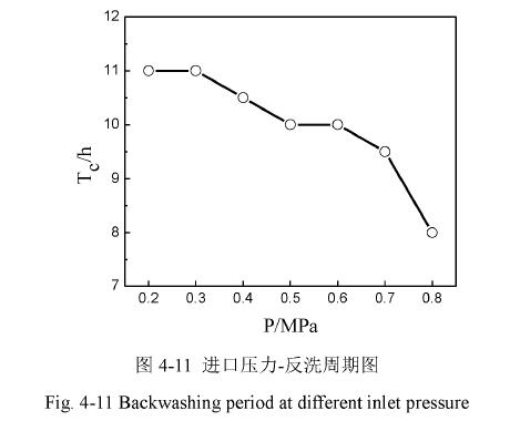 從圖來看,反洗的周期在進(jìn)口壓力超過以后迅速下降。經(jīng)過分析,可能是因為壓力過大以后,在陶瓷膜的內(nèi)外壁的壓差也隨之,容易在膜的表面形成較致密的污染層;另一方面,過大的壓力導(dǎo)致沉淀區(qū)出現(xiàn)過多的擾動,使本已沉淀下來的磷酸銨鎂浮動起來,惡化了膜表面的堵塞情況。