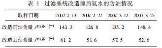 采用微孔陶瓷過濾器進(jìn)行氨水除油,從2007年2月運(yùn)行半年以來,取得了很好的效果,為后道工序創(chuàng)造了良好的條件,穩(wěn)定了生化污水的進(jìn)水水質(zhì),提高了污水處理效率。氨水表面看不到有明顯的浮油。蒸氨塔底部排出的焦油量大幅度減少。蒸氨塔塔壓降低,排油管道堵塞次數(shù)明顯減少。經(jīng)化驗得知,氨水含油量大幅度降低,從以前的140mg/l降低到目前的60mg/l,表1為氨水過濾系統(tǒng)改造前后氨水含油量的對比情況。